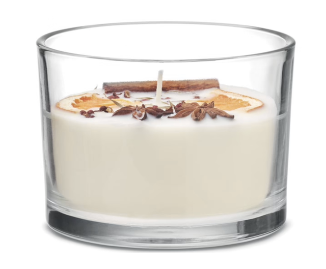 1 Geparfumeerde plantaardige kaars met gedroogde bloemen en vruchten (kaneel en citrus) in glazen pothouder.