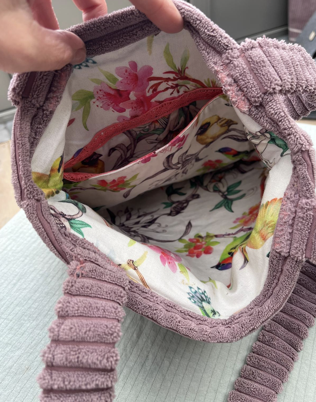 Tas velours 31*28 cm met binnenkant vogeltjes (zelfgemaakt) OUD ROZE